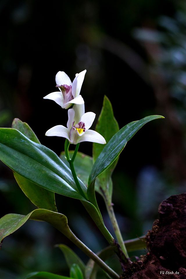 植物體株高約15-20公分。具有匍匐狀的地下根狀莖,以及肉質、狹圓柱狀、疏生的假球莖,新生的假球莖為略帶灰色的黃綠色,表面被有短柔毛,基部具鞘,並隨著時間逐漸變黑。假球莖頂部具2枚葉片。葉片肉質,表面光滑,卵狀披針形,先端漸尖。冬季-春季開花(11月-翌年2月)。花序頂生,直立或略呈弓形,高約15公分,總狀花序疏生2-6朵花。花白色,花被片狹披針形,蠟質,徑約4-5公分。花壽短,約一週,沒有香氣。